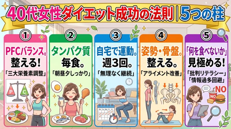 ここからが本題です。40代女性が無理なく続けられて、きちんと結果が出るダイエットの5つの柱を、順に解説します。