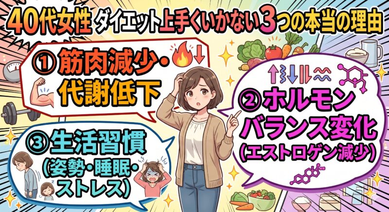 まず結論から。40代のダイエットが難しいのは、以下の3つが同時に起こっているからです。