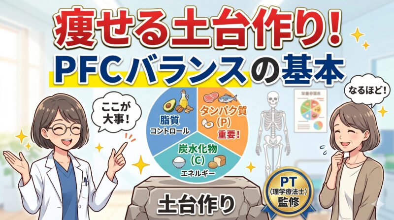 「PFCバランスを整えれば痩せると聞いたけど、何をどれだけ食べればいいか分からない」——40代女性からよく聞く悩みです。実はこれ、『PFCバランスの目安』と『簡単な計算法』さえ押さえれば誰でも実践できるダイエットの土台。理学療法士として8年、40代の方の食事指導をしてきた私が、論文と公的基準をもとに分かりやすく解説します。