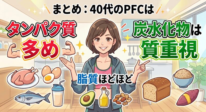 まとめ:40代のPFCは「タンパク質多め・脂質ほどほど・炭水化物は質重視」